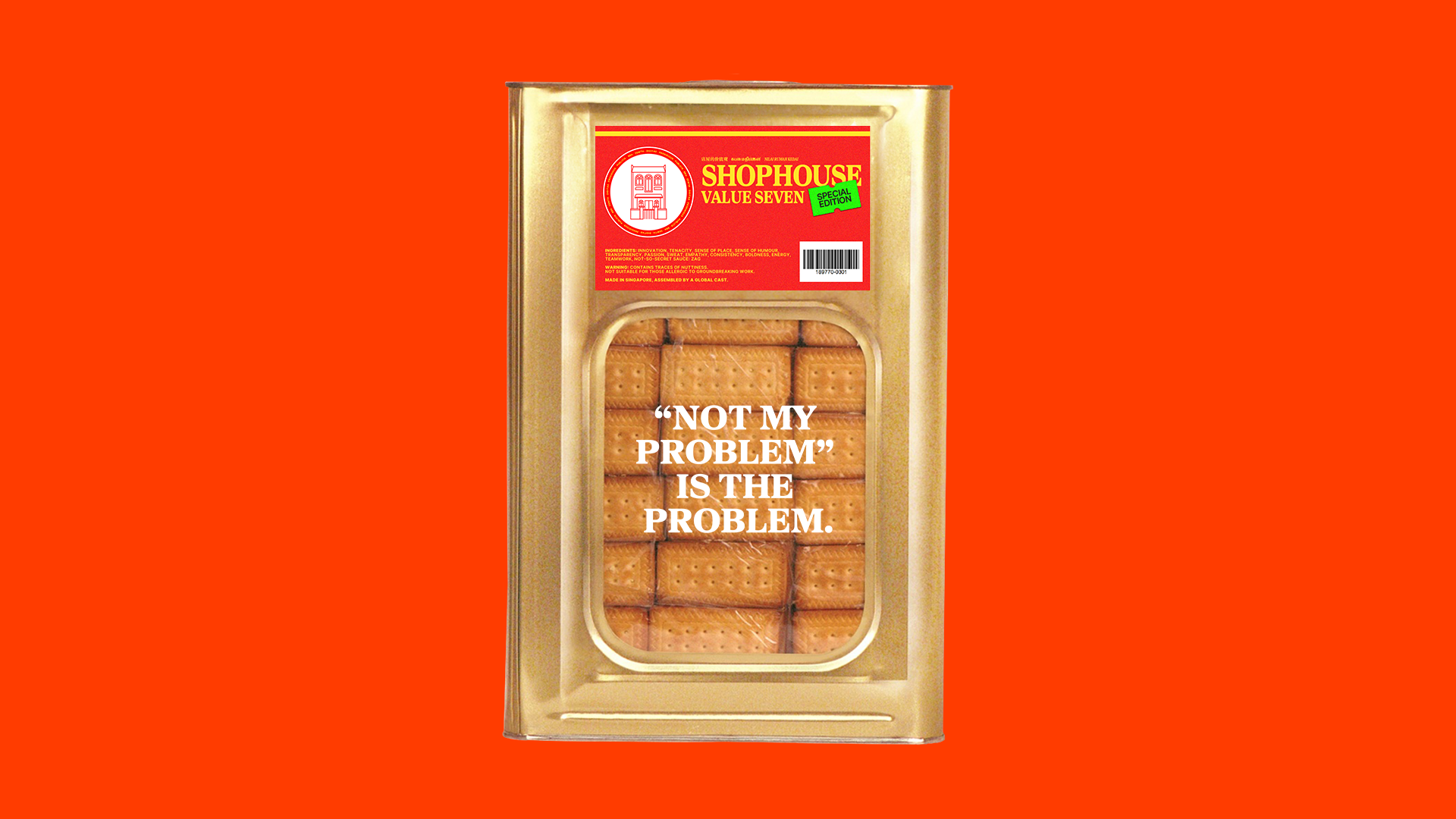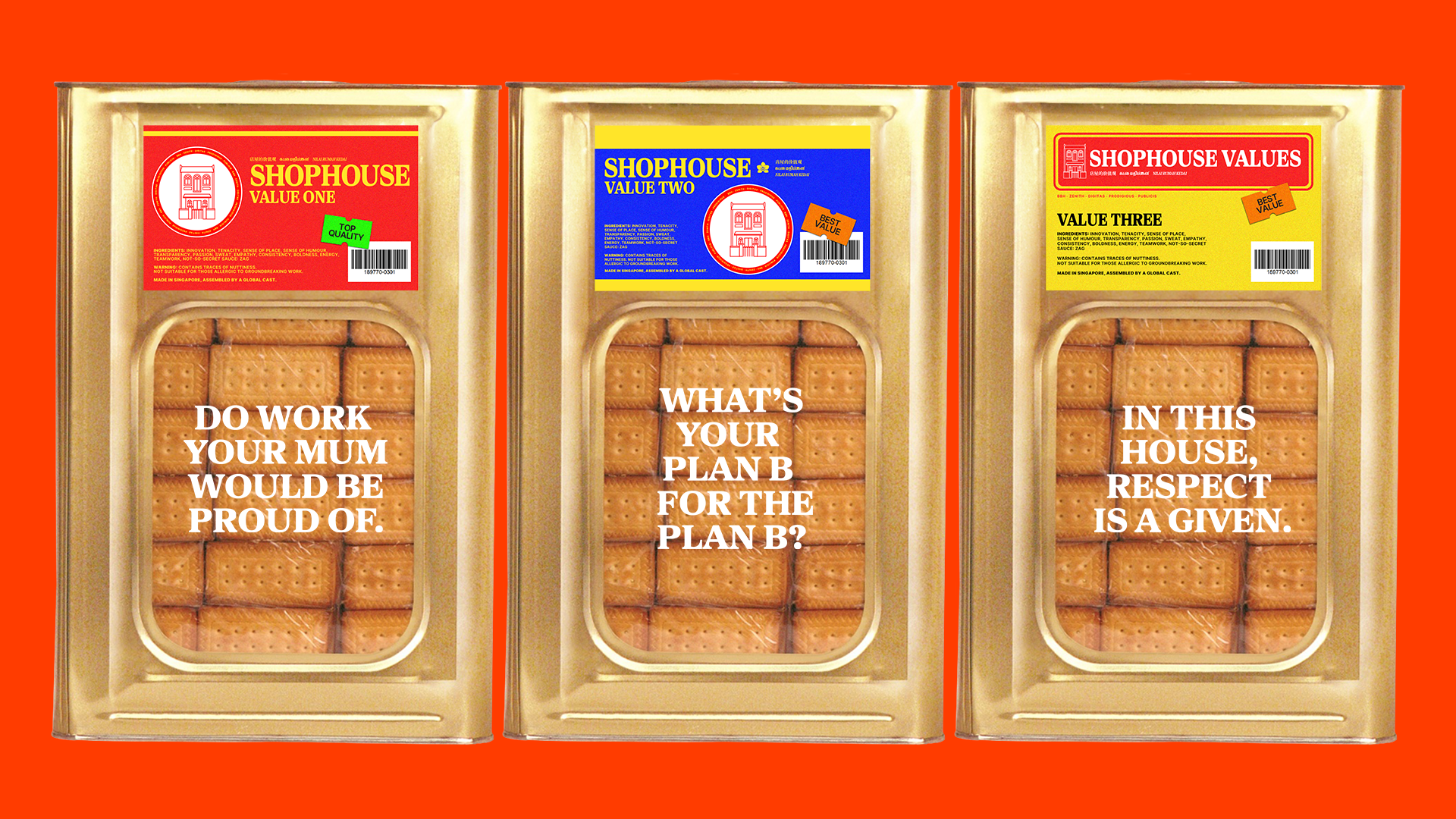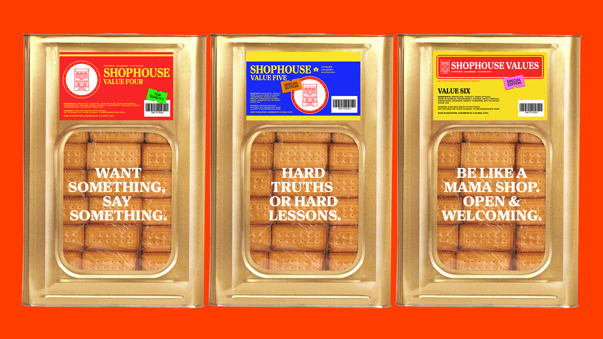 In keeping with our nostalgic name, ‘The Shophouse’, we drew from our cultural roots and created an edible installation instead. Headlines that sound like asian proverbs delivered by a Tiger mum, all packaged in an iconic biscuit tin box.